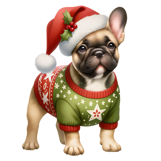 Precio habitual A partir de £0.75 GBPPrecio habitualPrecio unitario / por£2.39 GBPPrecio de oferta A partir de £0.75 GBPUn lindo bulldog francés vestido con un festivo gorro rojo de Papá Noel y un suéter navideño verde con un diseño de estrellas.