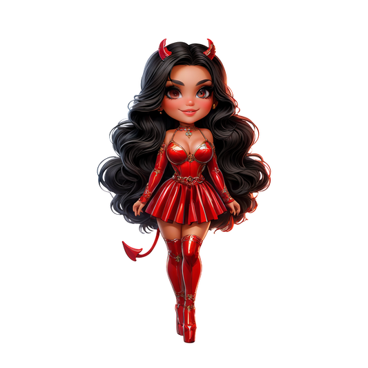 Una elegante muñeca con cabello largo y negro, que viste un llamativo atuendo rojo con una minifalda, tacones altos y cuernos de diablo.