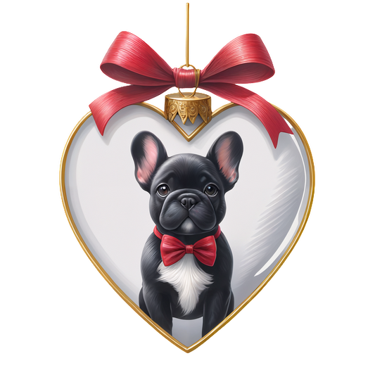 Un encantador adorno en forma de corazón que presenta un bulldog francés vestido con un moño y adornado con una cinta festiva.
