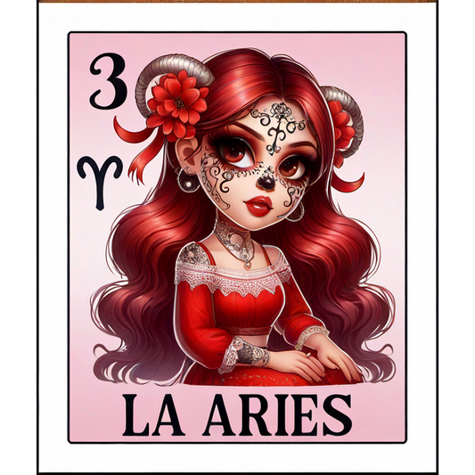 Precio habitual A partir de £0.75 GBPPrecio habitualPrecio unitario / por£2.39 GBPPrecio de oferta A partir de £0.75 GBPUna colorida ilustración que presenta a una chica con cabello rojo y maquillaje llamativo, que representa el signo zodiacal Aries en un estilo divertido.