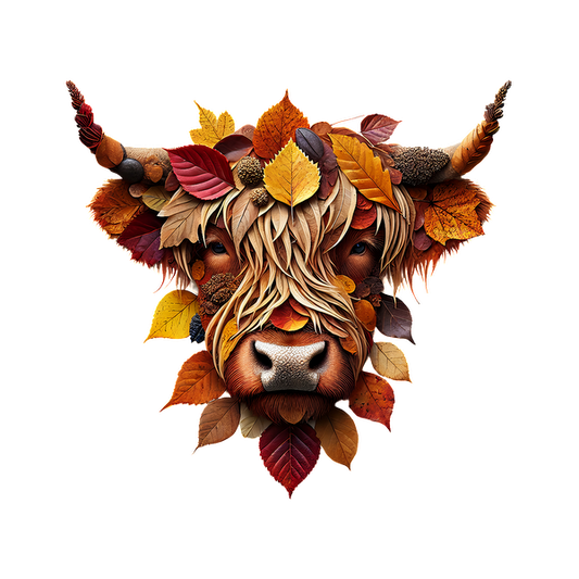Una representación creativa de una vaca de las Highlands adornada con vibrantes hojas otoñales y elementos naturales, que muestra un estilo cálido y caprichoso.