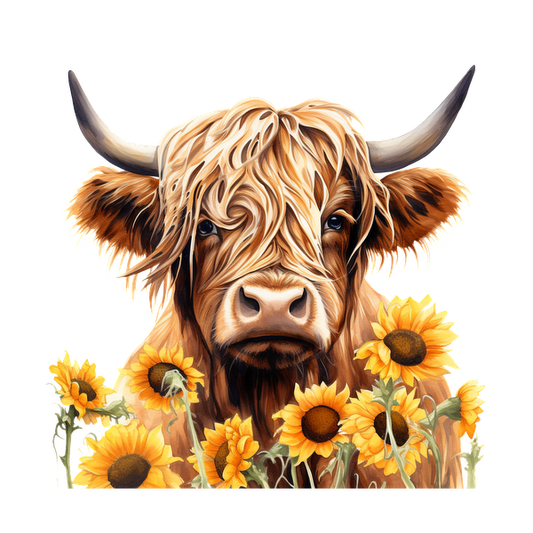 Una encantadora ilustración de una vaca de las Highlands rodeada de vibrantes girasoles, que muestra su distintivo pelo largo y peludo y su expresión gentil.