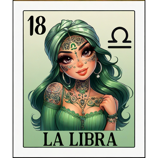 Una ilustración vibrante de una mujer con cabello verde y tatuajes intrincados, que representa el signo zodiacal Libra en una tarjeta.