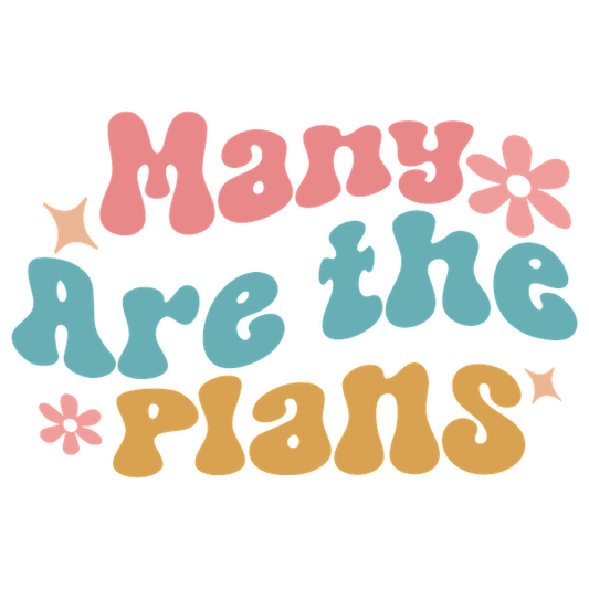 Un diseño gráfico colorido que presenta la divertida frase "Muchos son los *planes" en letras atrevidas y extravagantes con flores y estrellas.