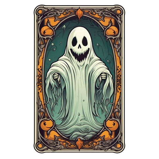 Precio habitual A partir de £0.75 GBPPrecio habitualPrecio unitario / por£2.40 GBPPrecio de oferta A partir de £0.75 GBPUn personaje fantasma divertido con cara de calavera y túnicas fluidas y translúcidas, enmarcado en un borde ornamentado y colorido.