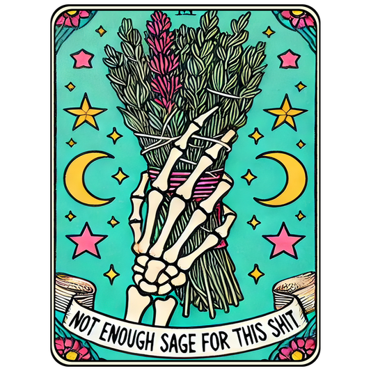 Una ilustración vibrante que muestra una mano esquelética sosteniendo un manojo de salvia, adornada con estrellas y lunas, con la leyenda "No hay suficiente salvia para esta mierda".