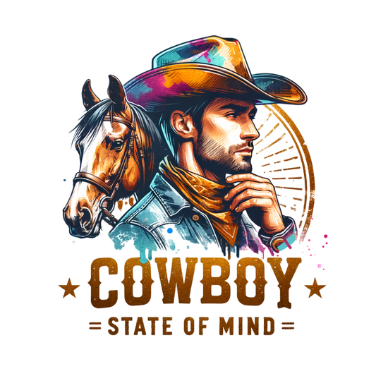 Una ilustración vibrante de un vaquero con un caballo, con el texto "Cowboy State of Mind" en letras en negrita.