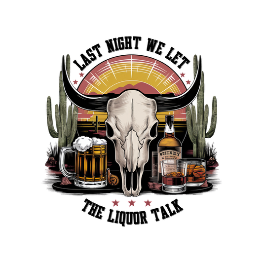 Un diseño llamativo que presenta un cráneo de toro flanqueado por cerveza, whisky y cactus sobre un fondo de atardecer vibrante.