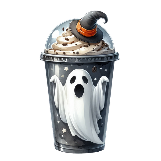 Un frappuccino festivo con temática de fantasmas cubierto con crema batida, un mini sombrero de bruja y chispas de chocolate, ¡perfecto para Halloween!