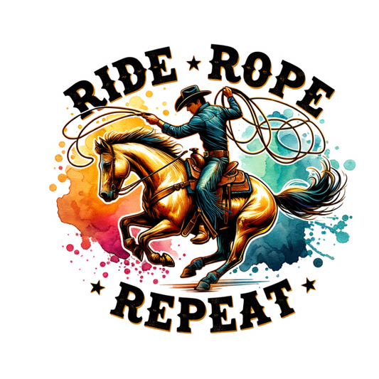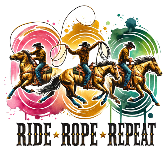 Un diseño vibrante y artístico que presenta un vaquero sobre un caballo, acompañado de la divertida frase "Ride Rope Repeat".