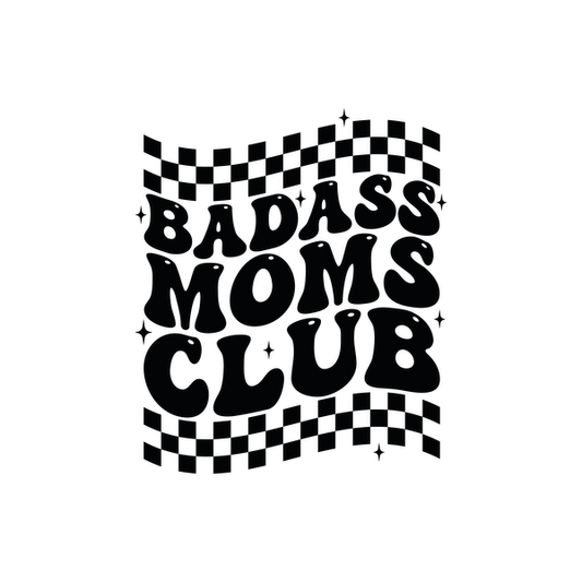 Un diseño atrevido y divertido que presenta la frase "Badass Moms Club" con un fondo a cuadros, perfecto para celebrar la maternidad empoderada.