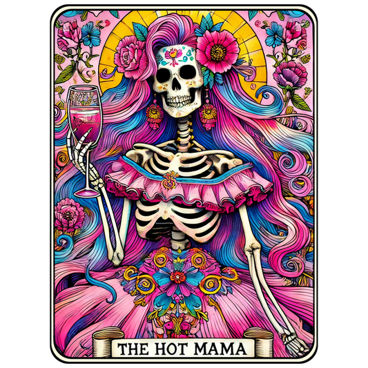 Una ilustración vibrante y colorida de una figura esquelética con un vestido floral sosteniendo una bebida, titulada "The Hot Mama".