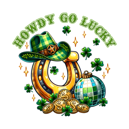 ¡Celebre la suerte con este diseño vibrante que presenta una herradura, un sombrero de vaquero verde, una bola de discoteca brillante y tréboles festivos!