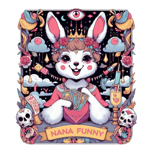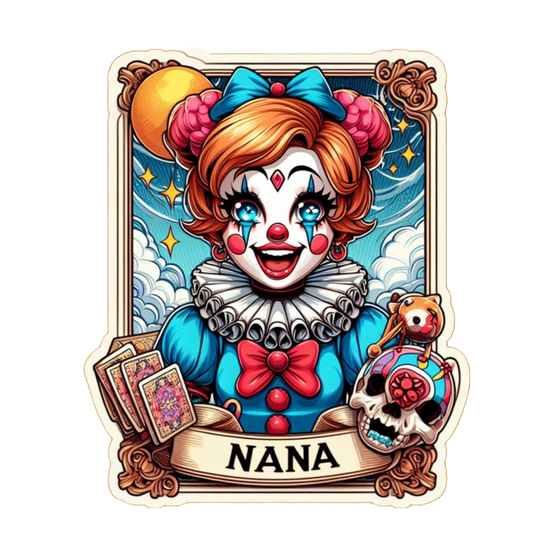Una vibrante ilustración de payaso llamada "Nana", que presenta imágenes de tarjetas divertidas, una calavera y una expresión alegre y caprichosa.
