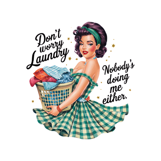 Una ilustración de inspiración retro de una elegante mujer con un vestido de cuadros vichy, que lleva alegremente una cesta de ropa sucia con ropa colorida.