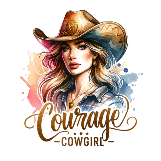 Una ilustración vibrante de una vaquera segura de sí misma, con cabello suelto y un sombrero de vaquero, que encarna el tema del coraje.