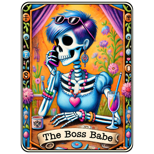 Precio habitual A partir de £0.75 GBPPrecio habitualPrecio unitario / por£2.40 GBPPrecio de oferta A partir de £0.75 GBPUna ilustración vibrante y divertida de un esqueleto elegante, apodado "The Boss Babe", disfrutando de una bebida y charlando por teléfono.