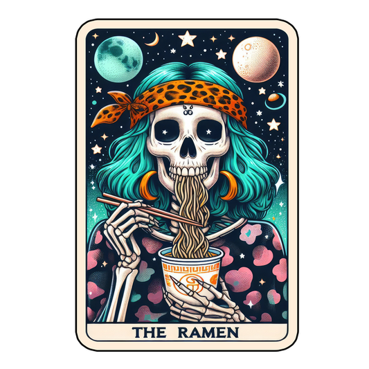 Precio habitual A partir de £0.75 GBPPrecio habitualPrecio unitario / por£2.40 GBPPrecio de oferta A partir de £0.75 GBPUna ilustración vibrante de un esqueleto disfrutando de ramen con palillos, sobre un fondo cósmico de planetas y estrellas.