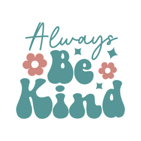 Diseño brillante y alegre que presenta la frase "Sé siempre amable", adornado con flores de colores y estrellas divertidas.