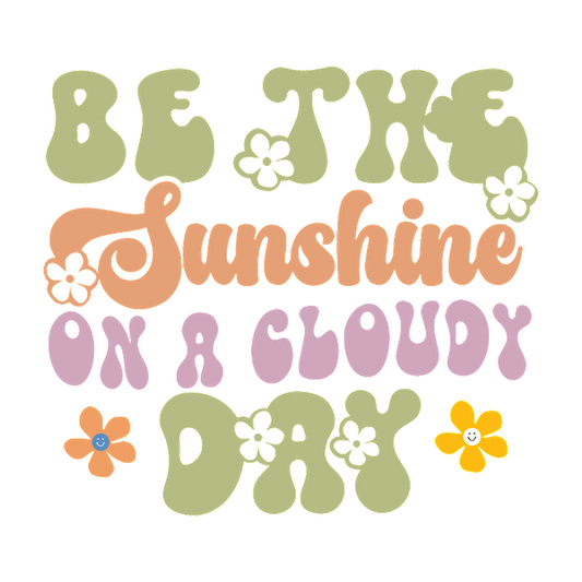 Gráfico brillante y alegre que presenta la inspiradora frase "Sé el sol en un día nublado", adornado con divertidas flores.