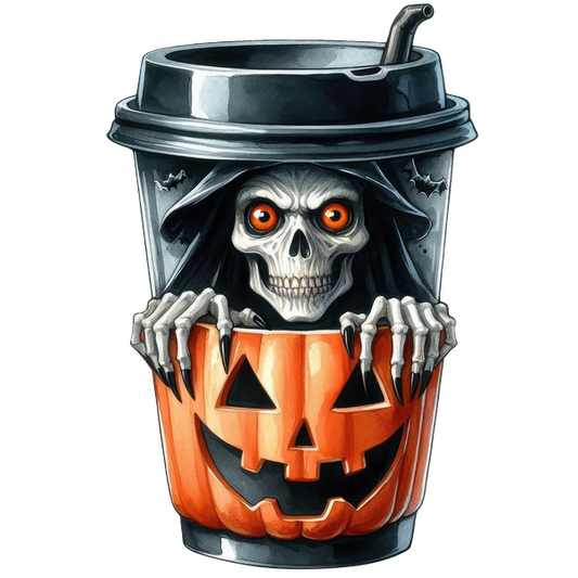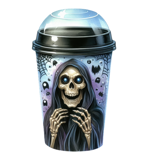 ¡Una taza de café espeluznante que presenta una figura esquelética con capucha, rodeada de diseños de telarañas y lindos murciélagos, perfecta para Halloween!