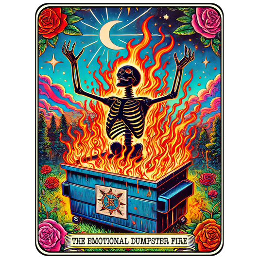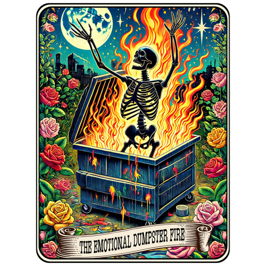 Precio habitual A partir de £0.75 GBPPrecio habitualPrecio unitario / por£2.40 GBPPrecio de oferta A partir de £0.75 GBPEsta vibrante ilustración presenta un esqueleto emergiendo alegremente de un contenedor de basura en llamas en medio de rosas coloridas, titulada "El incendio emocional del contenedor de basura".