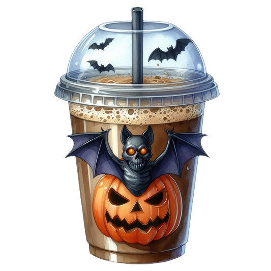 Una espeluznante bebida con temática de Halloween que presenta un murciélago posado en una linterna de Halloween, con una pajita y diseños espeluznantes.
