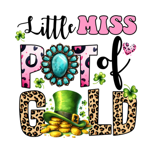 Un diseño vibrante y divertido que presenta a "Miss Pot of Gold", adornada con un sombrero de duende, monedas de oro y un divertido estampado de leopardo.