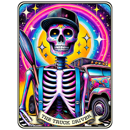Precio habitual A partir de £0.75 GBPPrecio habitualPrecio unitario / por£2.40 GBPPrecio de oferta A partir de £0.75 GBPUna ilustración vibrante y colorida que presenta un conductor de camión esqueleto con gorra, rodeado de un fondo psicodélico.
