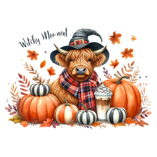 Una caprichosa vaca de las Highlands con un sombrero de bruja y una bufanda a cuadros rodeada de calabazas coloridas y una bebida festiva.