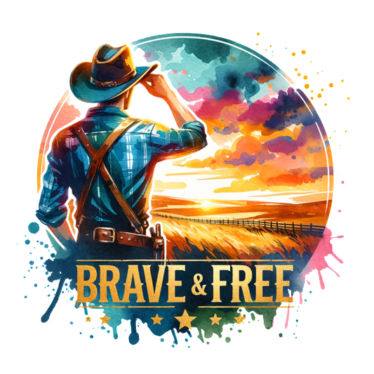 Una ilustración vibrante de un vaquero contemplando una puesta de sol con las palabras "Valiente y libre" destacadas.