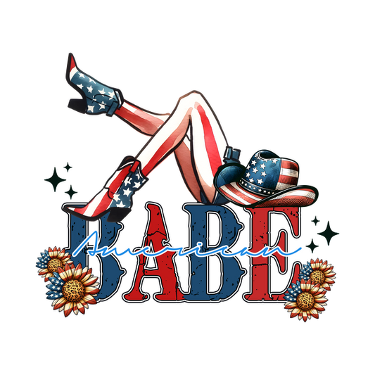 Un gráfico vibrante que presenta un diseño divertido de piernas patrióticas, tacones elegantes y un sombrero de vaquero, que celebra a una "chica estadounidense".