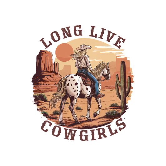 Celebre el espíritu de aventura con esta vibrante ilustración de una vaquera montada en un caballo moteado con un fondo desértico.