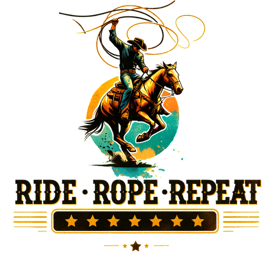 Un gráfico vibrante de vaquero que presenta a un jinete sobre un caballo, acompañado de la frase "Cabalgar. Cuerda. Repetir".