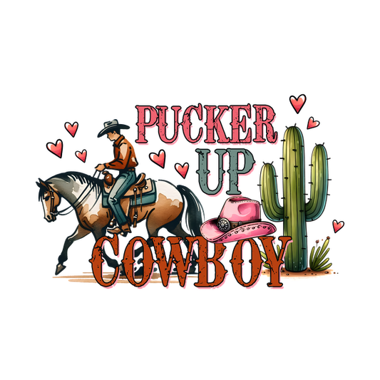 Un diseño de vaquero caprichoso que presenta un jinete a caballo, cactus, corazones y la divertida frase "Pucker Up Cowboy".
