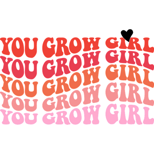 Diseño de texto colorido y divertido "You Grow Girl" con letras atrevidas y redondeadas en varios tonos de rosa y naranja.