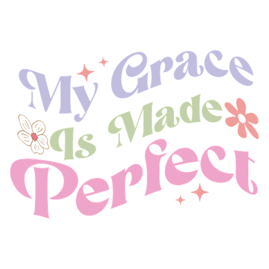 Un diseño gráfico colorido y alentador que presenta la frase "Mi gracia se hace perfecta", adornada con flores y tipografía divertida.