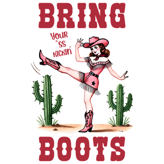 Una divertida ilustración de estilo vintage que presenta a una vaquera vestida de rosa con cactus y la frase "Trae tus botas".