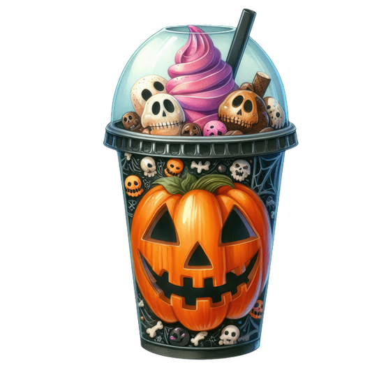 Una bebida festiva con temática de Halloween que presenta una taza de calabaza sonriente, cubierta con helado en forma de remolino morado y decoraciones de calaveras.