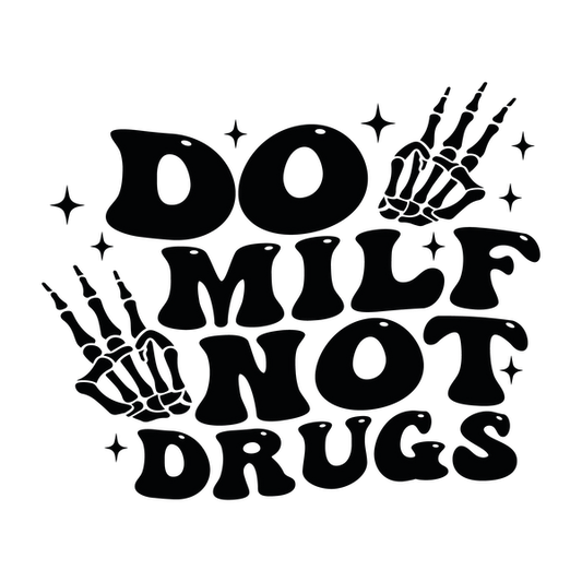 Un diseño gráfico audaz que presenta la frase "DO MILF NOT DRUGS" (MILF, NO DROGAS), acentuada con manos esqueléticas y estrellas decorativas.