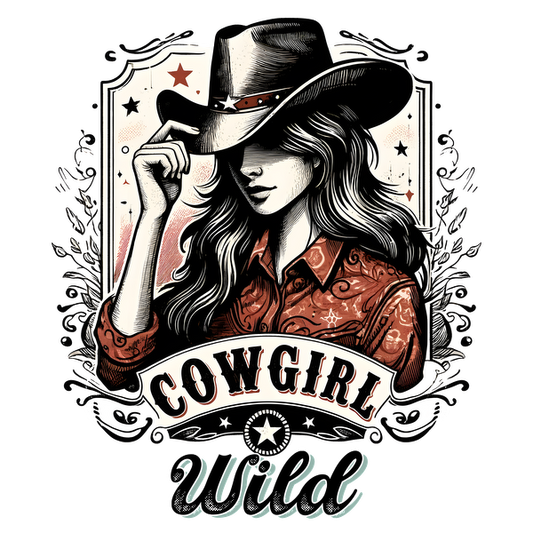 Elegante ilustración de una vaquera con sombrero, que encarna un espíritu salvaje en colores vibrantes y detalles intrincados.