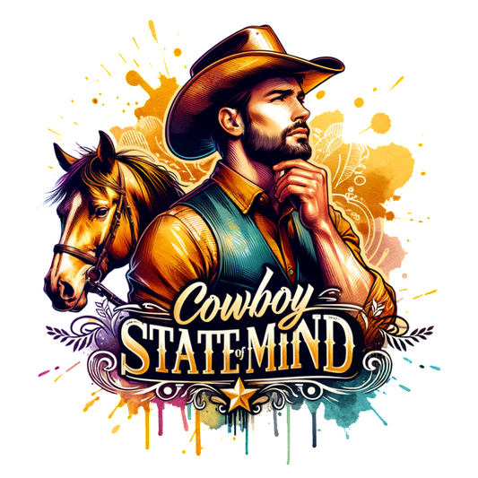 Una ilustración vibrante de un vaquero pensativo con un caballo, con la frase "Cowboy State of Mind" en tipografía atrevida.