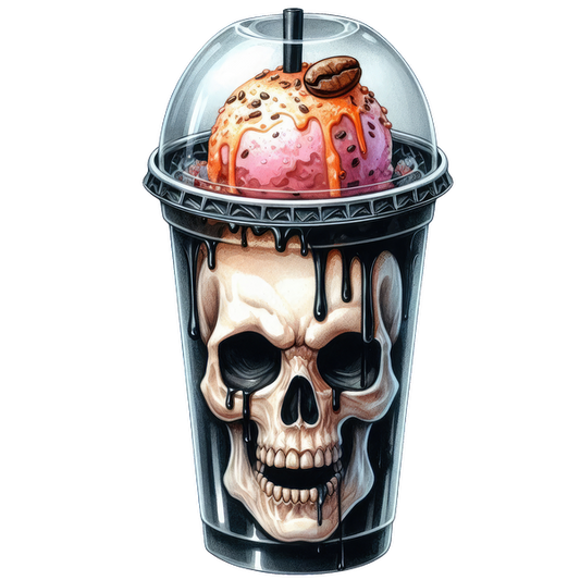 Una llamativa bebida helada con temática de calavera cubierta con helado rosa vibrante, jarabe de chocolate y una guarnición de granos de café.