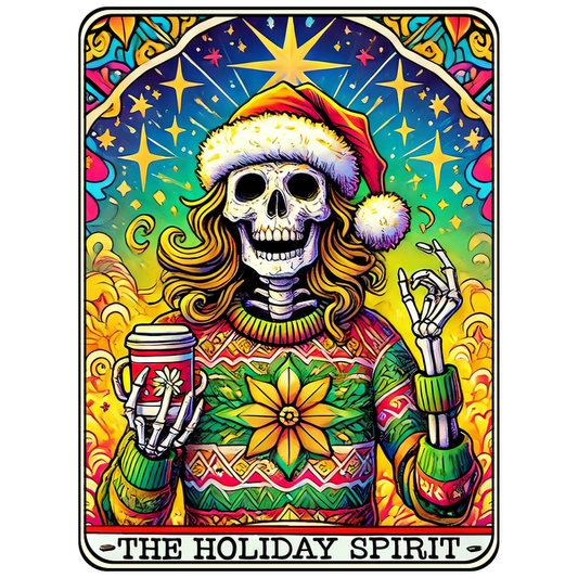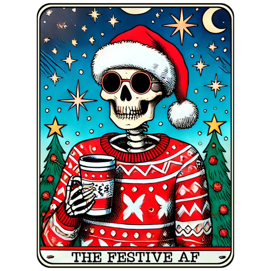 Precio habitual A partir de £0.75 GBPPrecio habitualPrecio unitario / por£2.40 GBPPrecio de oferta A partir de £0.75 GBPUna peculiar ilustración que presenta un esqueleto con un suéter festivo y un gorro de Papá Noel, sosteniendo una bebida sobre un alegre fondo invernal.