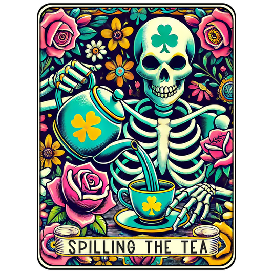 Una ilustración vibrante y colorida que presenta un esqueleto sirviendo té con tréboles, rodeado de rosas y flores, titulada "Derramando el té".