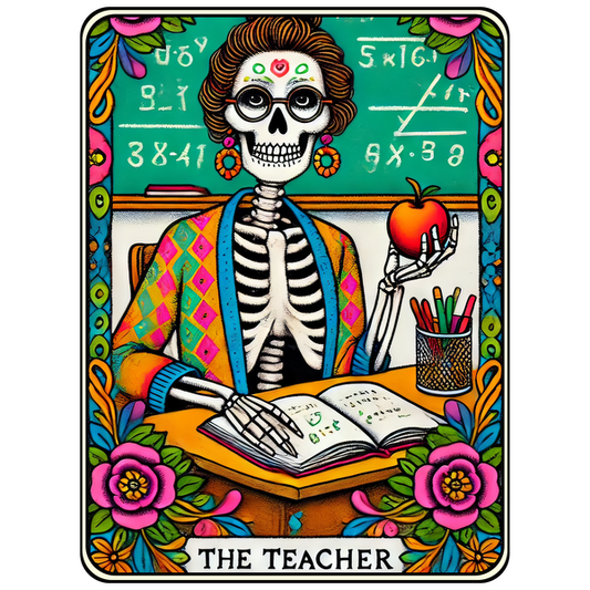 Precio habitual A partir de £0.75 GBPPrecio habitualPrecio unitario / por£2.40 GBPPrecio de oferta A partir de £0.75 GBPCelebre la educación con esta vibrante obra de arte que presenta a un maestro esquelético con un atuendo colorido, sosteniendo una manzana y rodeado de flores.