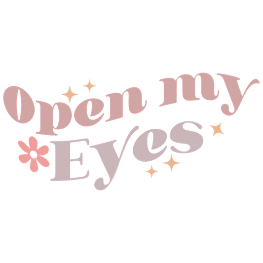 Un diseño de texto divertido y colorido que presenta la frase "Abre mis ojos" con estrellas decorativas y un detalle floral.