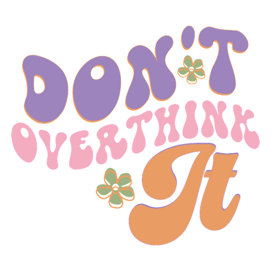 Un gráfico vibrante y divertido con la frase "NO LO PIENSE SOBREMANERA" en letras retro coloridas adornadas con flores.