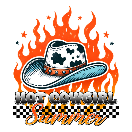 Un diseño vibrante que presenta un elegante sombrero de vaquera en medio de llamas ardientes, con las palabras "Hot Cowgirl Summer" claramente visibles.