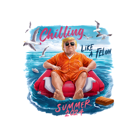 Una divertida ilustración de un hombre con un traje naranja relajándose en un flotador, con gaviotas y un eslogan humorístico para el verano de 2024.